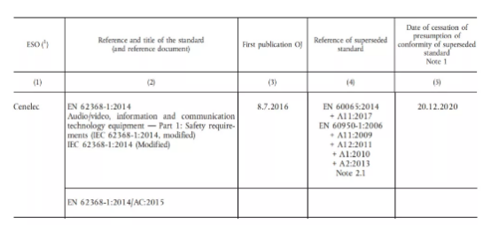 依據歐盟CE標志對于“置于市場”的時間認定,只要產品進入銷售之時就必須符合法規,說明產品在2020年12月20日起將無法以EN 60950-1與EN 60065標準進入歐盟市場。