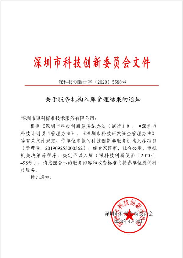 重要通知:我司深圳市訊科標準技術成科技創(chuàng)新券的服務機構(gòu)