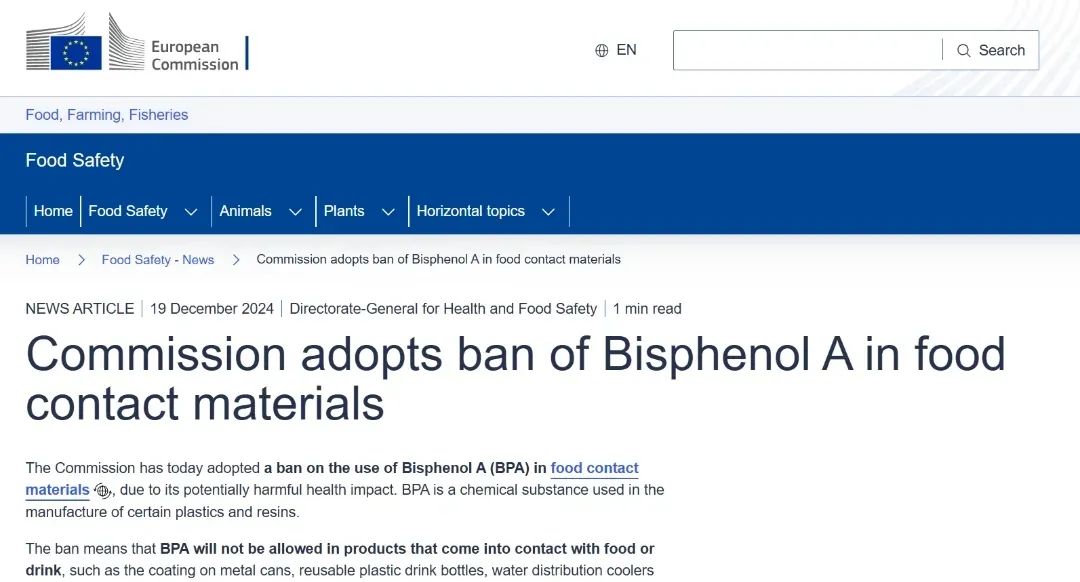 法規(guī)原文:https://food.ec.europa.eu/food-safety-news-0/commission-adopts-ban-bisphenol-food-contact-materials-2024-12-19_en