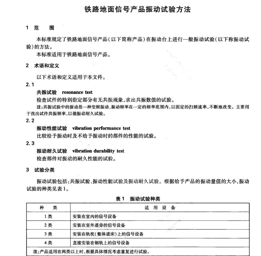 本標準適用于鐵路地面信號產(chǎn)品的振動試驗,這些產(chǎn)品包括但不限于信號機、道岔轉(zhuǎn)換裝置、軌道電路設(shè)備等。目的是驗證這些設(shè)備在運輸、安裝及運行過程中可能遇到的各種振動條件下能否正常工作。