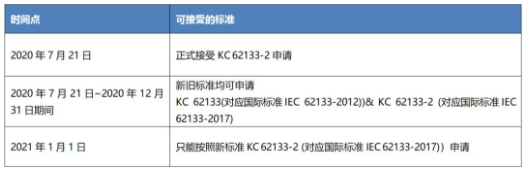 2020721日,韓國技術標準局KATSKorean Agency for Technology and Standards)發布新通知:KC 62133-2 正式確認并開始使用。其對應的國際標準IEC 62133-2012版和IEC 62133-2017版的CB報告及證書在20201231前均可以被接受用于KC轉證。具體時間點