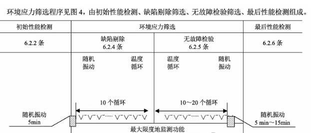 篩選過程中應對產品的功能和性能進行監測,在最長 20個循環內只要連續10個循環不出現故障,產品即通過了溫度循環篩選;在最長15min內連續 5min不出現故障,產品即通過了隨機振動篩選。