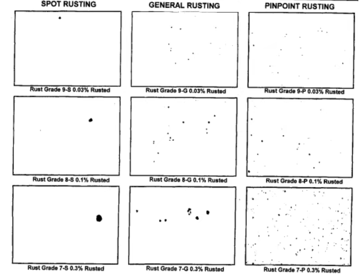 點狀(Spot):試件表面的少數區域出現較大的點狀生銹。片狀(General):試件表面的較大面積的片狀生銹。微小點狀(Pinpoint):試件表面散布的極細小的斑點狀生銹。混合型(Hybrid):包括點狀、片狀、微小點狀幾種現象同時存在的生銹