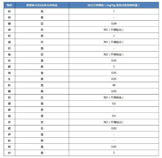 以下是關于上表1的一些要點:重金屬特定遷移的元素種類從原有的9種(鋇、鈷、銅、鐵、鋰、錳、鋅、鋁、鎳限值不變)增至24種(新增銨、銻、砷、鎘、鈣、鉻、銪、釓、鑭、鉛、鎂、汞、鉀、鈉、鋱),其中4種鑭系元素(銪、釓、鑭、鋱)的限值為0.05mg/kg,砷、鉻、鉛、汞的限值為不得檢出(0.01mg/kg),鎘為不得檢出(0.002mg /kg),其他元素沒有限值要求。