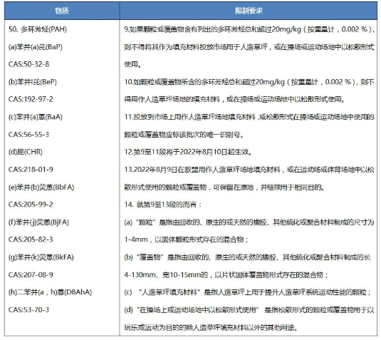 2021年7月21日,歐盟在其官方公報發(fā)布新法規(guī)(EU) 2021/1199,修訂歐盟REACH法規(guī)((EC) No 1907/2006)附件XVII第50條目,新增在人造草坪、操場或運動場地中用作填充物的顆粒或覆蓋物中多環(huán)芳烴(PAHs)的限制。該新法規(guī)將于歐盟官方公報發(fā)布后第20天生效。
