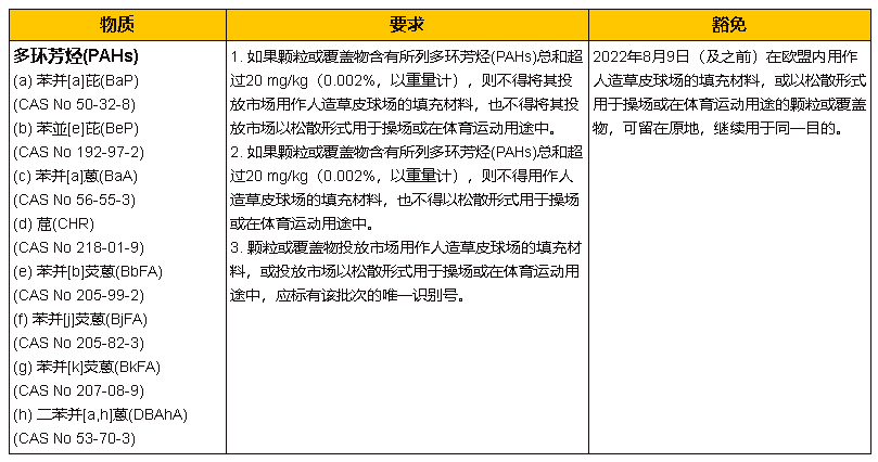 2021年7月21日,歐盟委員會(huì)發(fā)布了法規(guī)(EU) 2021/1199,修訂REACH法規(guī)(EC) No 1907/2006附錄XVII第50項(xiàng),新增限制用作人造草皮球場(chǎng)的填充材料、以松散形式用于操場(chǎng)或在體育運(yùn)動(dòng)用途中的顆粒和覆蓋物中8種多環(huán)芳烴(PAHs)的含量。該修訂將于2021年8月10日生效,并將從2022年8月10日起實(shí)施。 以下為修訂的詳細(xì)內(nèi)容: