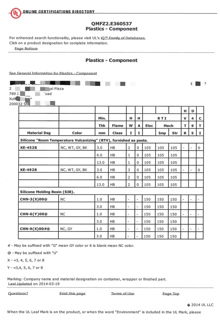 Min. Thick. 試片最小厚度單位為mm。在上述黃卡中,試片厚度為0.75mm時,對應的阻燃等級為V-2。試片厚度為3mm時,對應的阻燃等級為V-0,5VB。
